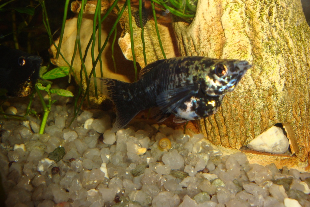 Gnusmas, чем объяснить смену цвета не знаю. У меня с этими мольками тоже не всё так просто. Этот малек был получен от абсолютно черных родителей. Выводок был уже четвертый, до этого рождались черненькие мальки, без пятнышек. И, вдруг, появились эти. Сначала все мальки были пятнистыми, но из 5штук, которые оставила для себя, три поменяли цвет на черный, причем ими оказались самцы. А две самочки остались пятнистыми. От одной из них был получен малек пару дней назад. Часть выводка черная а вот другая часть светло-серая, почти белая. В чем причина, не знаю.