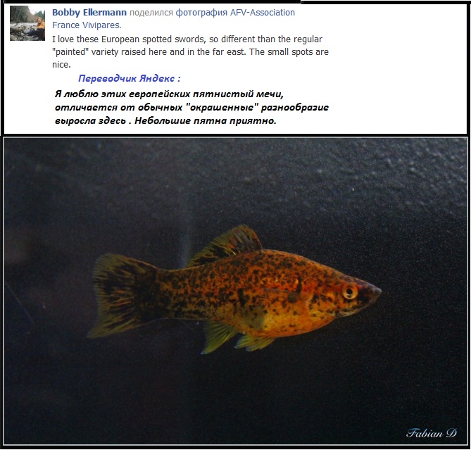 Я думаю нужно поздравить Павла Викторовича Отрощенко на Аквафоруме Pavel13 , С опубликованием его статьи на извесном Немецком сайте Das Xiphophorus Hochzucht Portal. Здесь его укороченная статья о работе над вильчатой формой самцов меченосцев с фунуциональными гоноподиями - http://www.platys.net/modules.php?na...rticle&sid=234