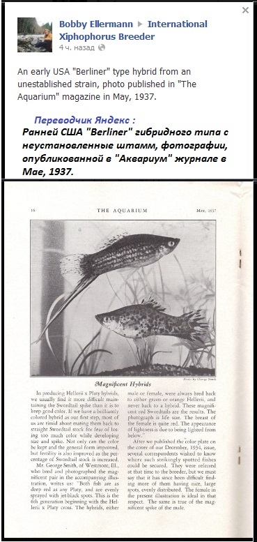 В 80-е , у любителей " были в моде" тигровые меченосцы . Хочу сказать , что это была высокого качества рыба с обычными , флаговыми и вильчатыми плавниками с мелкой равномерной россыпью черных пятен . Рыба казалась посыпанной черной крупой на яркой красной подложке , как на фото 1 . Потом во времена перестройки все стали заниматься другими породами и делами , и ,наверное, можно констатировать факт , что породы и линии тигровых меченосцев 80-х ушли в небытие . Изредка на птичне встречается жалкое подобие "старых тигровых" с крупными черными пятнами в районе хвоста и переходящими на хвостовой плавник , что грозит меланомой . Продавцы называют их леопардовыми , ягуаровыми ... , но по сравнению с тигровыми 80-х , повторюсь , смотрятся они жалко . Не знаю почему их у нас называют тигровыми ... тигровых полос у них нет , а лиш мелкий черный крап . В Германии и США их называют Берлинцами . Международное название тигровых меченосцев - Берлинцы . В некоторых областях у нас и в России Берлинцами называют меченосцев с черным рисунком Вэгтэйл /бабочка / , очевидно потому , что вэгтэйлы при совке были завезены Зоообъеденением из восточного Берлина . Сейчас на International Xiphophorus Breeder пошла тусовка о тигровых меченосцах , некоторые интересные фото на мой взгляд выкладываю . С исторической точки зрения интерес представляет фото № 4 Боба Эллермана , тигрового меченосца в 1937 году .