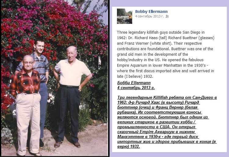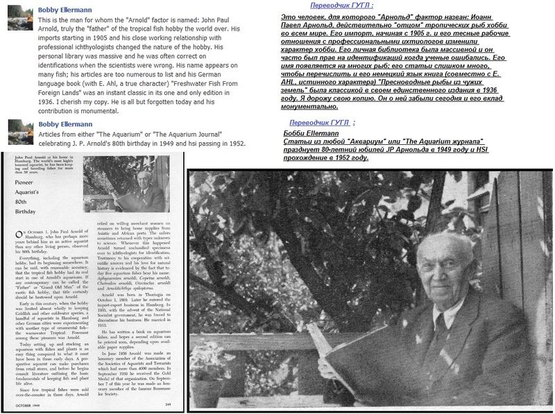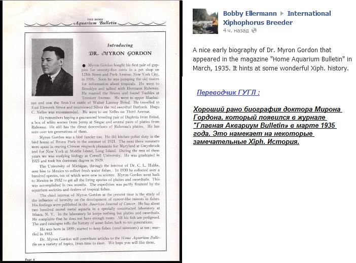 Ниже несколько старых эксклюзивных фотографий людей , чьи имена связаны с тем великолепием живородок , которые плавают в наших аквариумах . Ими еще в первой половине прошлого века были получены и закреплены , многие цветные рисунки меченосцев и пецилий . Видовое название копеины - арнольди , связано с именем извесного специалиста по рыбам - Иогана Пауля Арнольда 1869 - 1952 , немецкого аквариумиста / См фото 3 / . Копеина - арнольди не единственная рыба , носящая его имя . Существует род африканских цихлид - Arnoldichthys . По проффессии Арнольд был торговцем . Жил он в Гамбурге , портовом городе , знался с моряками , и поэтому очень многие виды тропических рыб , завозимых в Европу , в том числе и живородка , прежде всего попадали в его руки. Многое сделал для рода Xipxopxorus , биолог Майрон Гордон / 1899 - 1959 / , См. фото 2 . Он известен с конца 1920 -х годов . В 1939 году он основал Xipxopxorus Генетический фондовый центр . Он открыл и назвал несколько видов Xipxopxorus . Один из диких видов меченосцев назван в его честь Xipxopxorus Grdonii . Пецилии " вэгтэйл " /чернохвостые/ были созданы в 1940 году в Нью-Йорке доктором Майроном Гордоном , скрестившим диких " комет " с золотыми пецилиями . Золотые пецилии/фоновый цвет желтый/ , несли в себе незаметный экстенсорный ген , который в паре с рисунком "кометы" обеспечил возникновение "вэгтэйлов" . Оба гена аутосомальные доминантные . Извесная форма " кровавое сердце ", была выведена также Майроном Гордоном . Родителями породы стали самец дикарь из реки Рио Хамапа /для этих особей характерно слабое красное пятно в районе горла/ и самка пецилии с белым фоновым цветом и черными глазами . После обратного скрещивания получились рыбы , у которых пропал " дикий " серый фон , но на белом теле осталось красное горловое пятно . из-за отсутствия черно-серых пигментов фоновой окраски более интенсивным стал красный " галстук " .