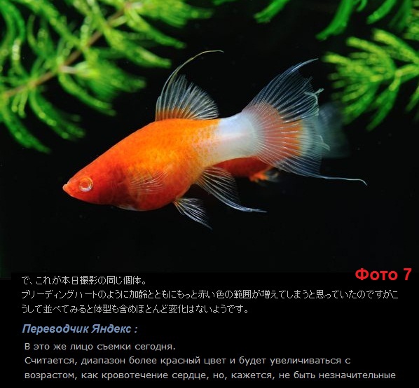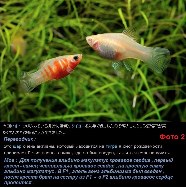 Интересно , что японцы из рода Хipxopxorus в основном занимаются пецилией макулатус . Просматривая сайты и блоги японцев , нашел много нового для себя . На фото 1, 2, 3 показано получение альбиносов пецилии макулатус "Кровавое Сердце" . Они были получены в Японии в 2006 году . Альбинос "Кровоточащее/кровавое/ сердце " , был получен вводным крестом . Использовали обычного , черноглазого самца породы кровавое сердце на обычную альбино самку макулатус . Не так давно в Японии были получены пецилии макулатус Кои Лиры . Это очень большая , трудоемкая работа , смотри фото 4, 5, 6, 7 . Ну и в заключение две фотографии /фото 8, 9 / , из многих пород пецилий макулатус , над которыми работают японские разводчики . . P . S . Для любителей пецилий статья в июньском 1997 года журнале Tropical Fish Ho bbyis - New Color Varieties of Platyfish . https://www.facebook.com/download/pr...25525787634446