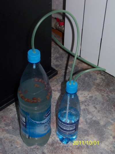 Таким образом сначала был изготовлен брагогенератор из 1,5л и 0,5л бутылок. В бутылке с водой подвод газа от браги сделан по длинной твердой трубке практически до дна.