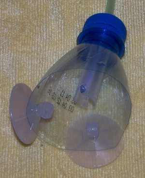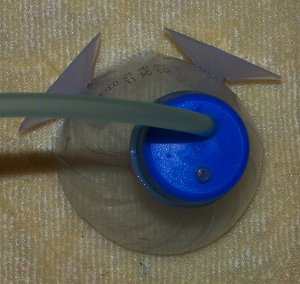 На помощь опять пришла пластиковая бутылка. Сначала я хотел использовать дно от 0,5л бутылки. Диаметр бутылки 6 см, что дает площадь раскрыва колокола примерно 28 см2. Но победило использование верхушки с крышкой, просто потому что я уже знал как просто закрепить трубочку подвода газа при помощи твердой трубки от воздушных шариков.