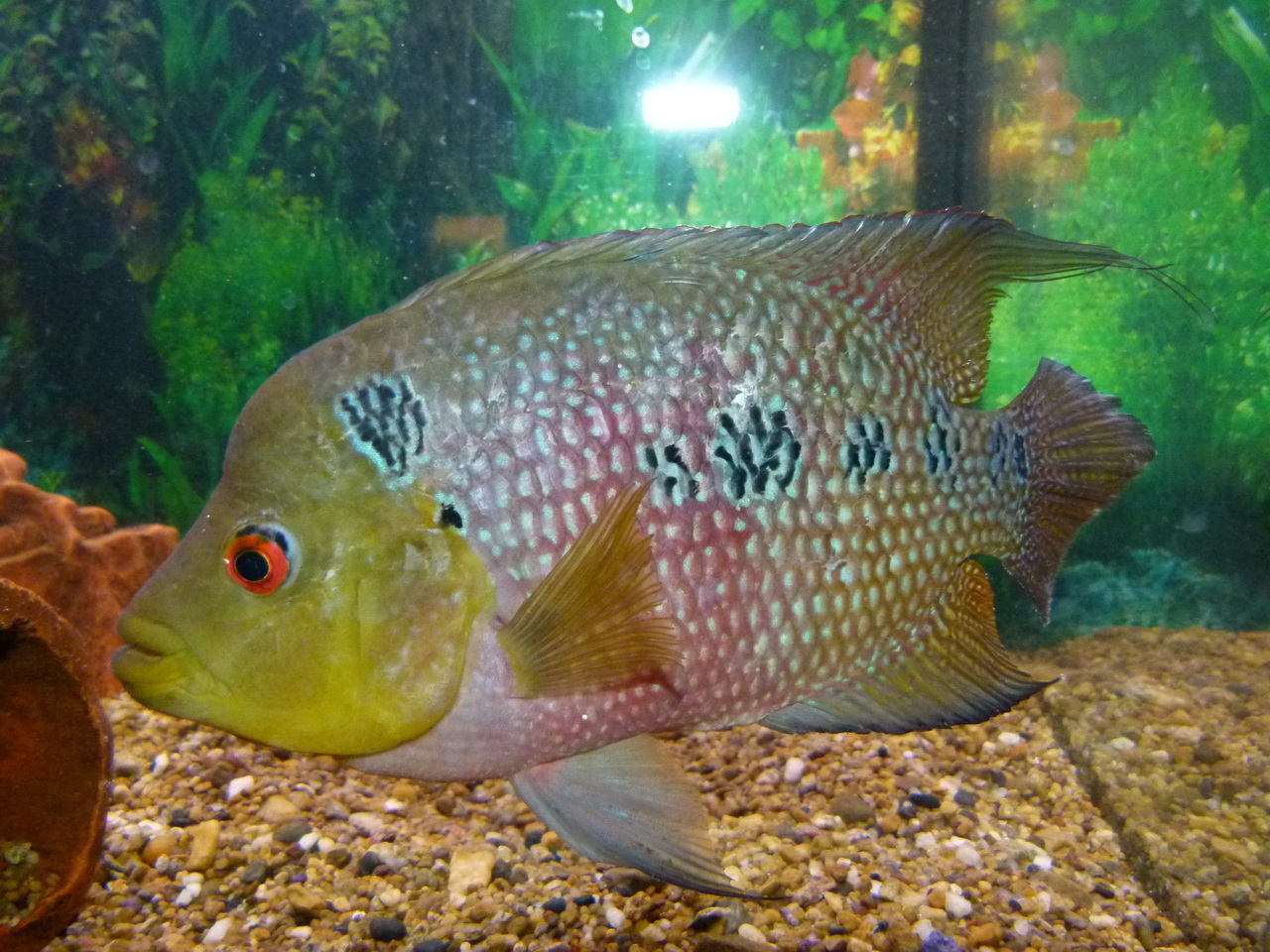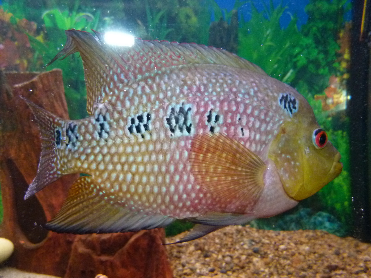 Есть немного фото, но к сожалению после пересадки в другой аквариум, поэтому лоб "сдулся" и окрас посветлел немного. Размер сейчас 17-18см.