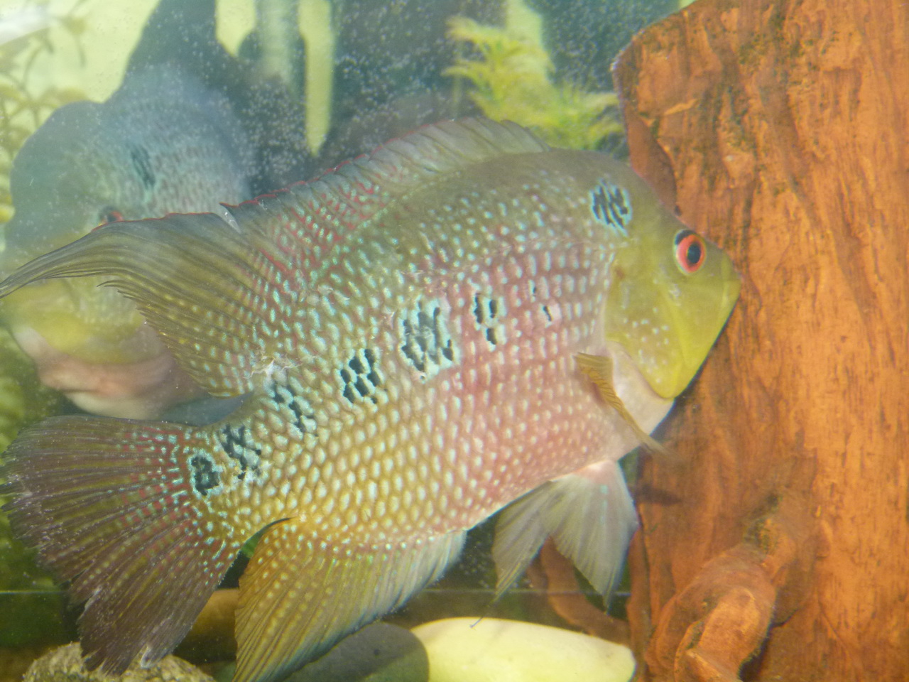 А я всё-таки раздобыл Тайсону пару и надеюсь что они у меня не "заголубеют" ))))))))) т.е. что это всё-таки самка, а не самец. На выставке было 5 хорнов, три самца и две самки, как мне объяснили. Одна самка белая (я так понимаю полинявшая), та точно самка, но белую я не захотел, а вот эта меня насторожила длинными косициобразными плавниками, но я всё-таки выбрал её. На выставке сказали, что она нерестилась и что это точно самка...