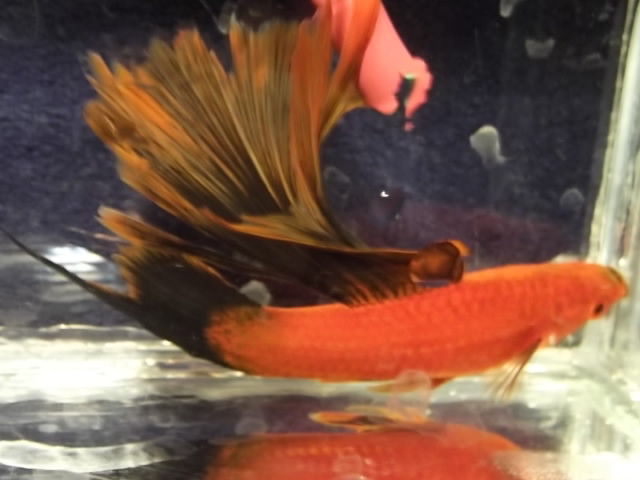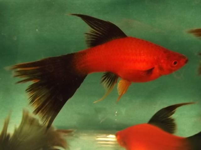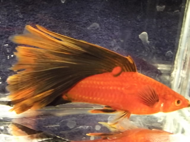 Сфотографировал одного из флаговых самцов. Спинной плавник у флаговых и юбка у самок растут всю жизнь . Очень больших размеров достигают после года. Я задумываюсь о обрезании плавников мечам - производителям/особенно самкам хвосты/ , как это делают гупешкам. Самки после 1,5 лет уже не в состоянии таскать свои юбки. на фото полугодовалая самка и годовалый самец. Верхний плавник у самца до полугода был черный , потом обтрепался и обесцветился до красноты.