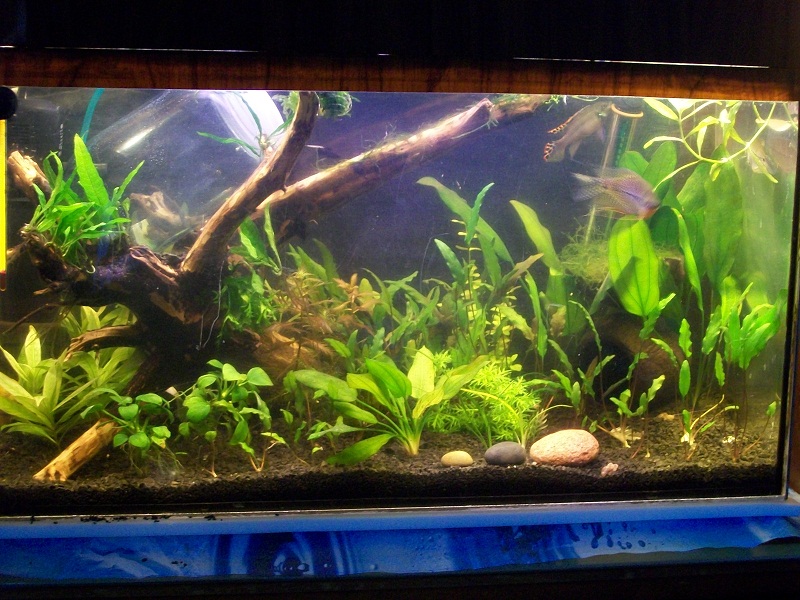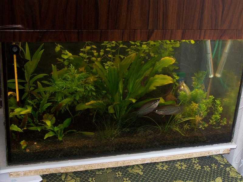 Живут здесь пара жемчужных гурами и 2 королевские тетры(деть их некуда). Добавил отражатели, поставил брагу. Растения менялись, росли и пропадали. Уход за аквариумом был не стабильным (мягко говоря  ). Теперь уход налажен. Вот что получается, или нет ....