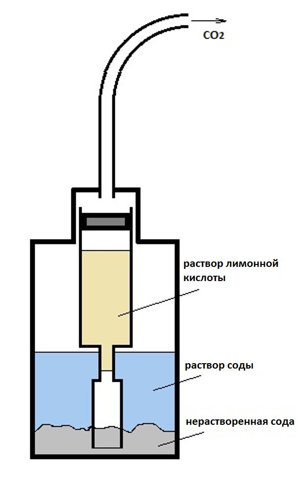 В данную конструкцию можно засыпать и больше реактивов. Главное, что бы уровень жидкости в кислотной бутылке, не превышал уровень расположения соды в содовой.