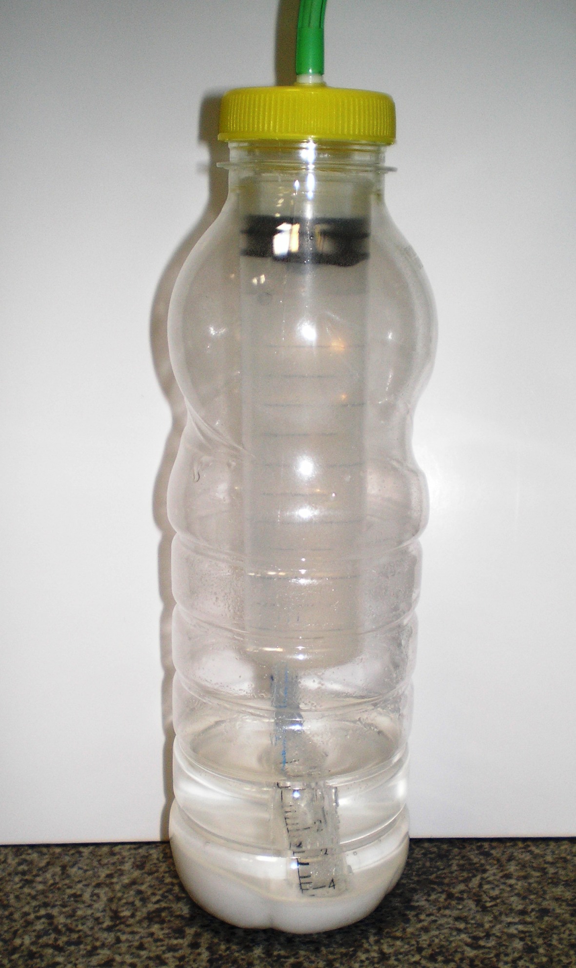 Запуск, он производится очень просто, перекрываем кран подачи СО2 в аквариум и сдавливаем рукой бутылку с кислотой, выдавив немного ее в соду, реакция начинается мгновенно и давление в обеих бутылках резко увеличивается (1-2,5 атмосферы).