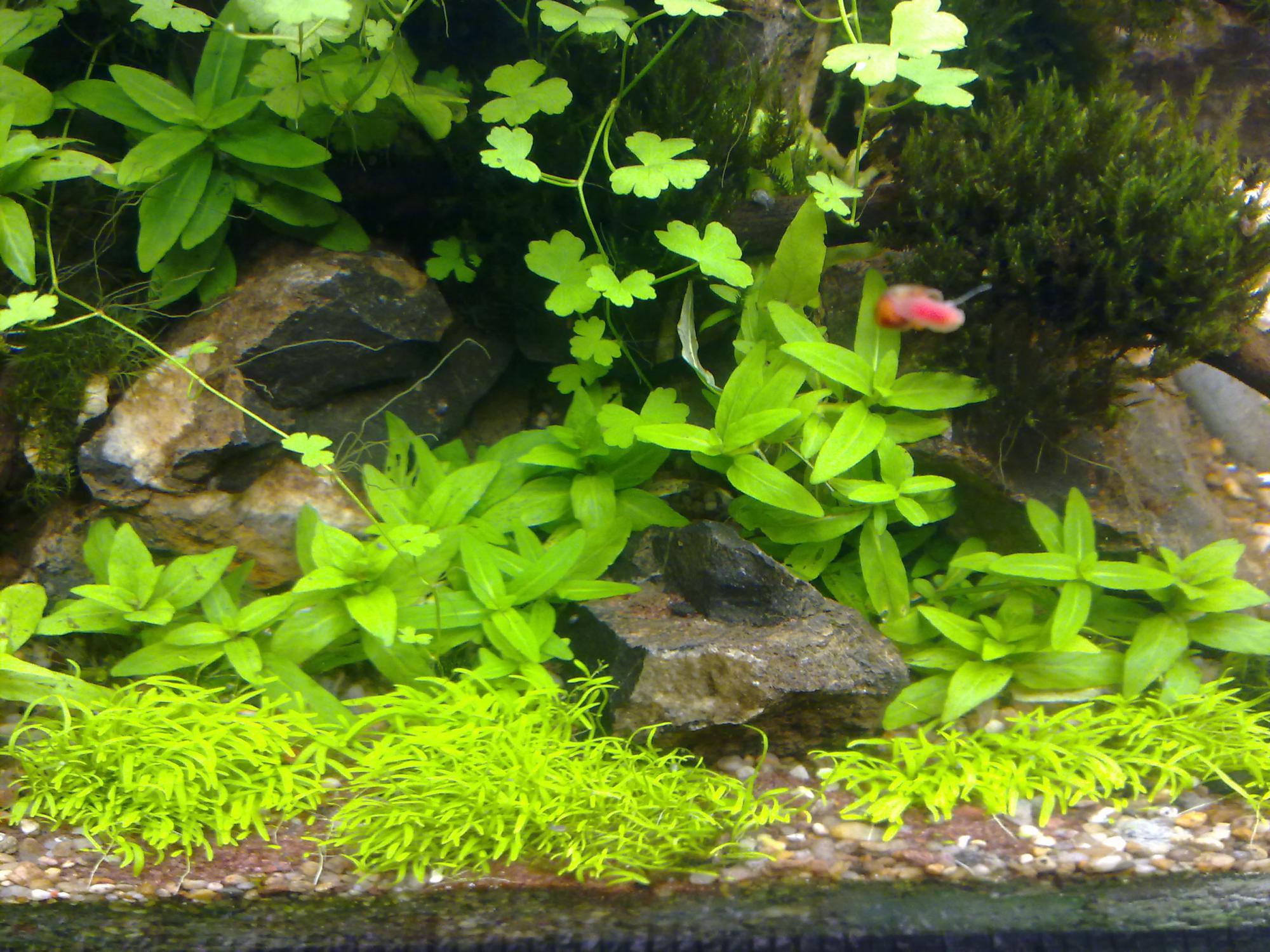 Это моя самая любимая травушка))-утрикулярия граминофолия.Получил кусочек 1*1 см,а теперь разрослась она на площадь 15*15 см.Часть в аквариум посадил,а часть в сампе растет.Фотки скину через 2-2.5 недели,когда уже все готово будет.А потом сразу радикально меняю этот скейп на другой,где основа будет идти на каменистые холмы,которые засажу утрикулярией