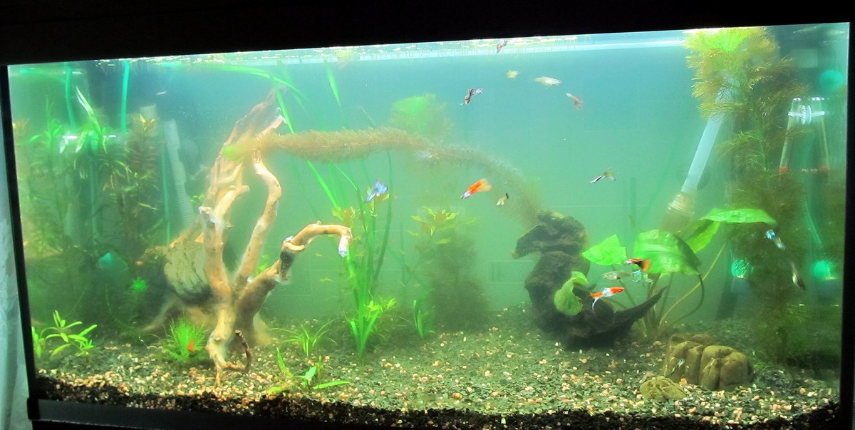 Хотела сделать все правильно, поэтому с запуском рыбы не спешила. Однако, отцу все не терпится запустить аквариум, и однажды придя домой я обнаружила стайку гуппи и одного меченосца. В оправдание смог сказать только, что не покупал их, на работе подарили))))