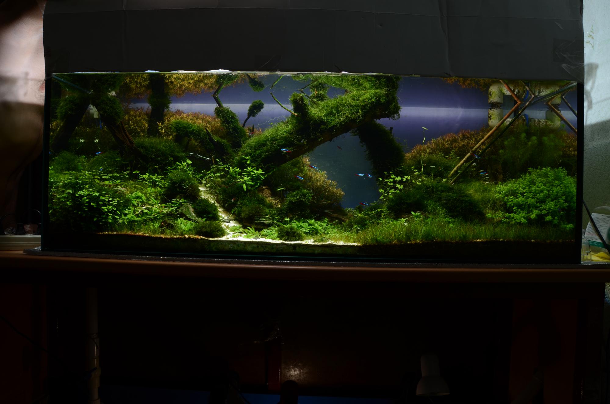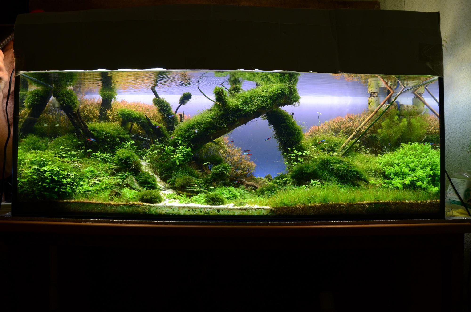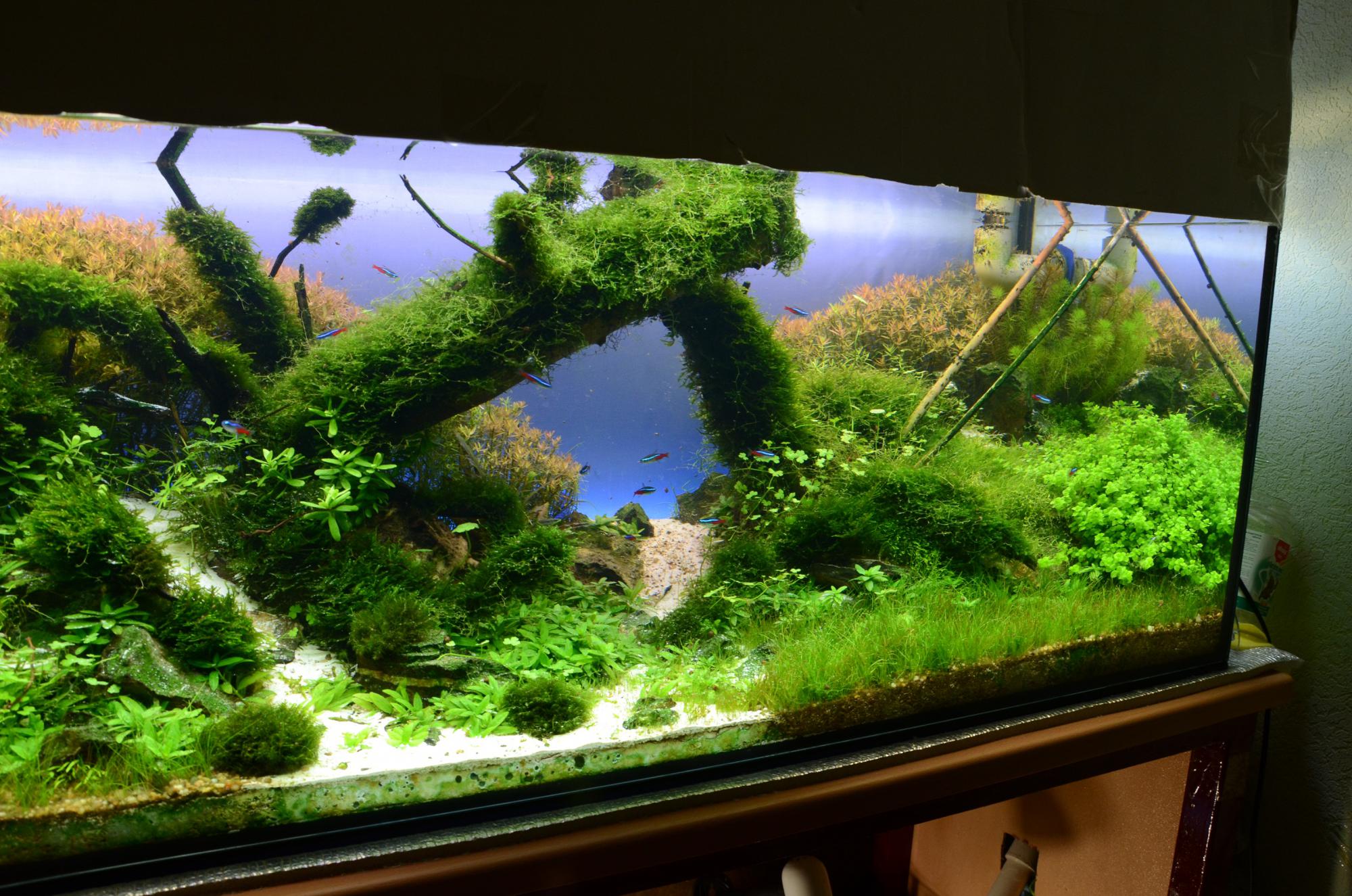 Две коряги по центру образуют треугольник и все внимание на себя забирают. Взгляд сразу же падает на центр аквариума. Если бы вы левую корягу подняли, а правую опустили пониже, было бы намного лучше.