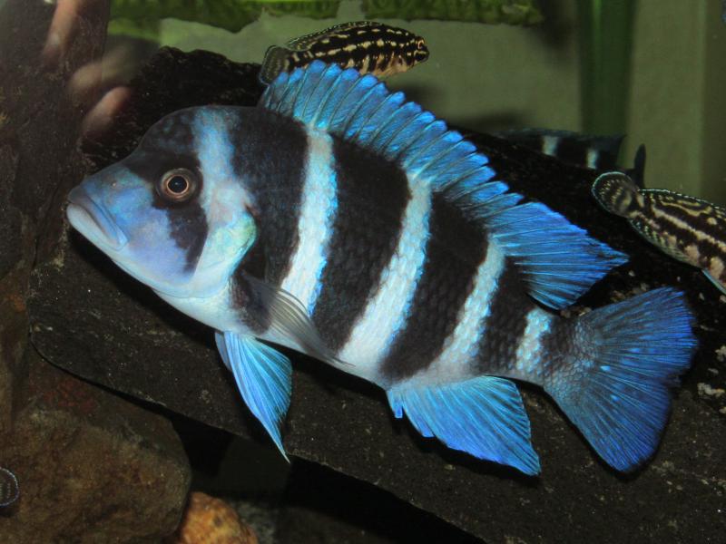 Рыбе больше года-точно не смогу сказать.Все брались и росли вместе.Из семи штук двое выделяются размерами и лбами-5 штук около 10см,один 13 см и тот,что на фото около 14 см(перемерял как переводил в акву около месяца назад).Посмотрел фото ,сделанные сразу после приезда ко мне-плавники длиннее были.Точно Малави обгрызли,гады((.На фото эта же рыба.Фото сделано 25 апреля сего года.