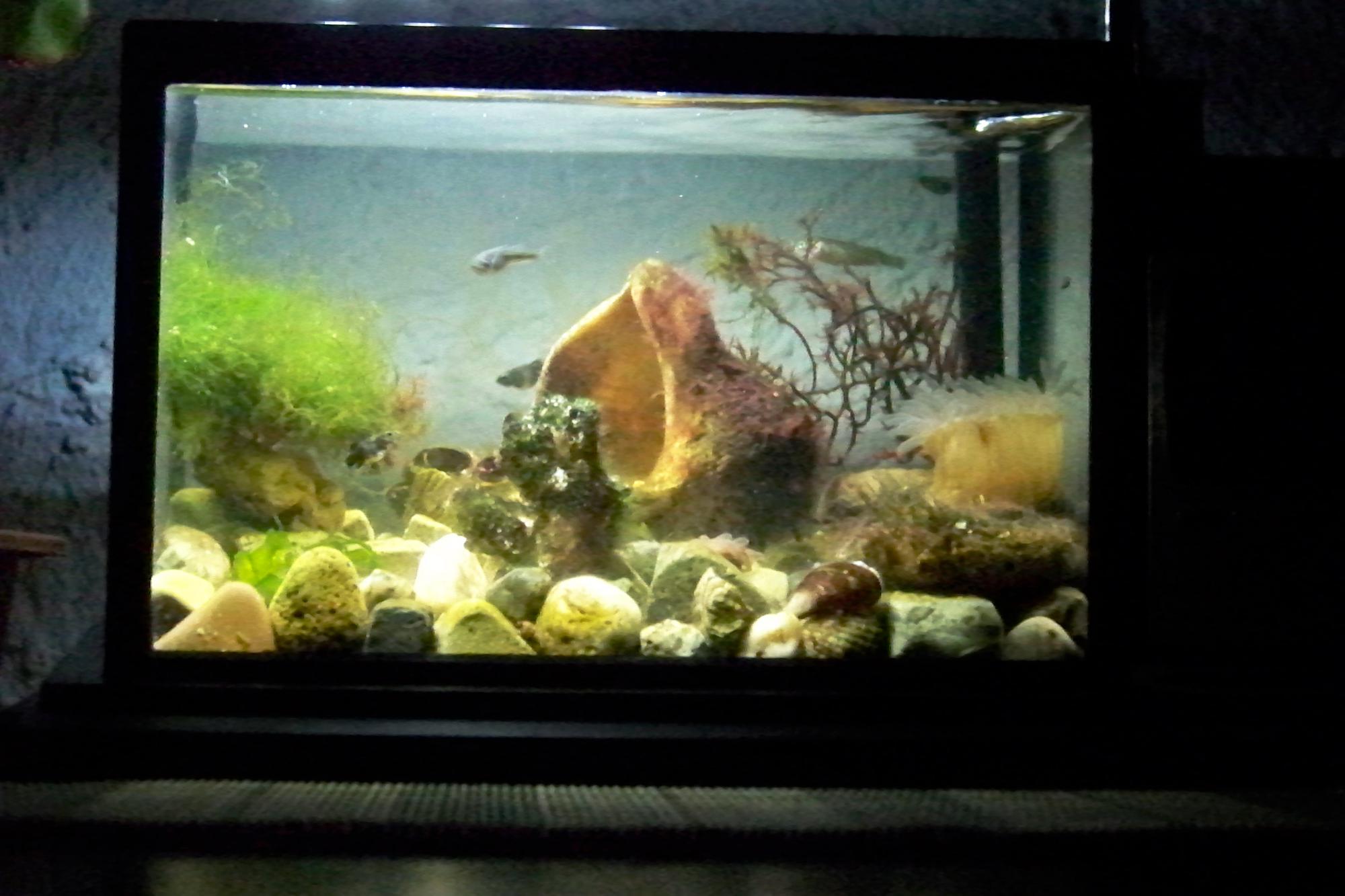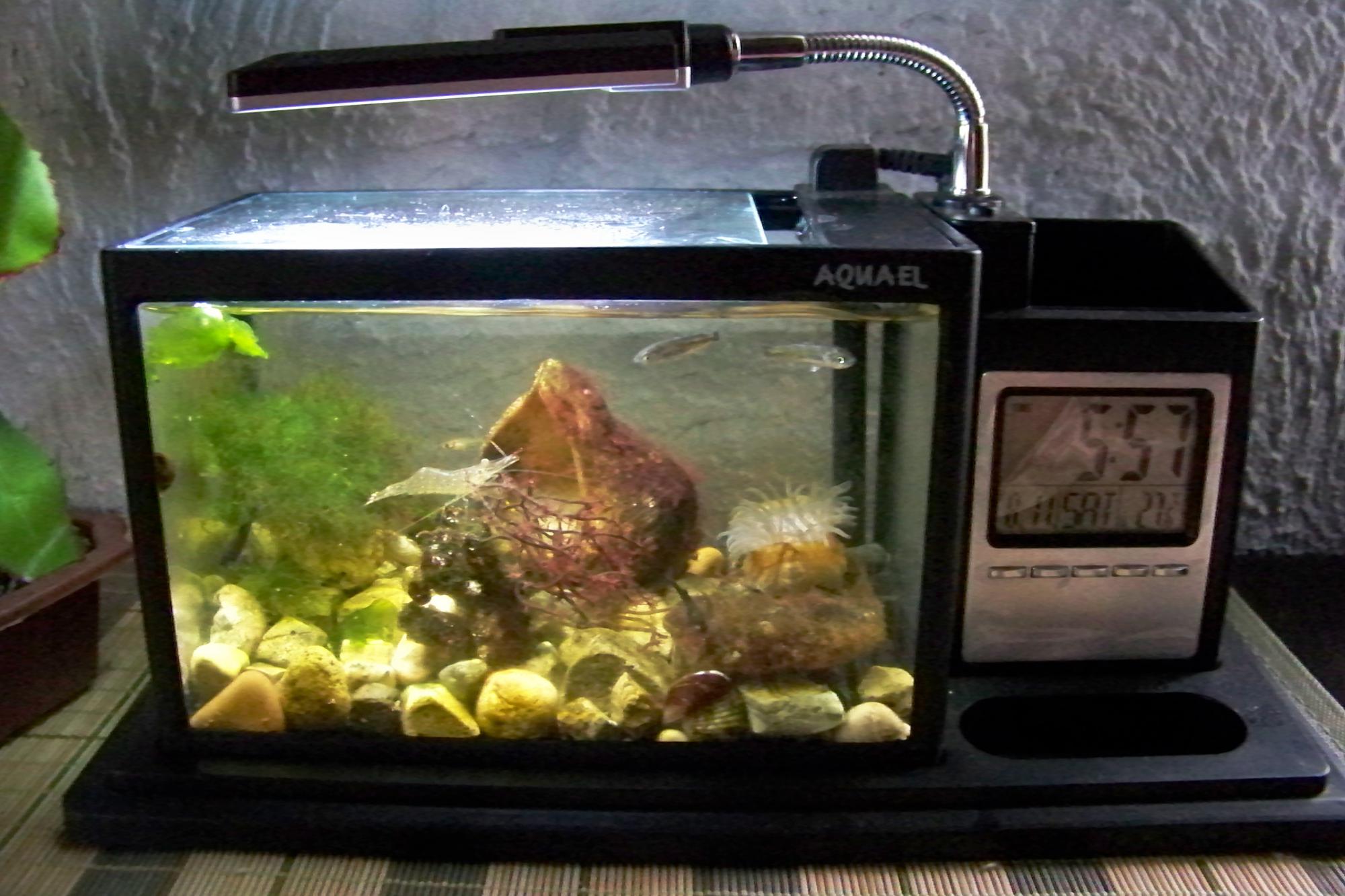 Можно, конечно, взять крупную ракушку или камни помельче... Да и композицию можно было сделать поинтересней (здесь вообще композицией не пахнет). Но мне интереснее другое: к примеру, подарил я подобный аквариум коллеге по работе в другом офисе. То есть, я не вижу аквариум, не могу повлиять "на его самочувствие". При этом исходим из того, что виртуальный коллега - не дебил, рыбок кормит правильно, воду подливает, свет включает, насос не выключает. Сколько такой аквариум останется в добром здравии без глобальной чистки? Можно ли делать такие подарки (т.е. дарить их "вместо пепельницы")?