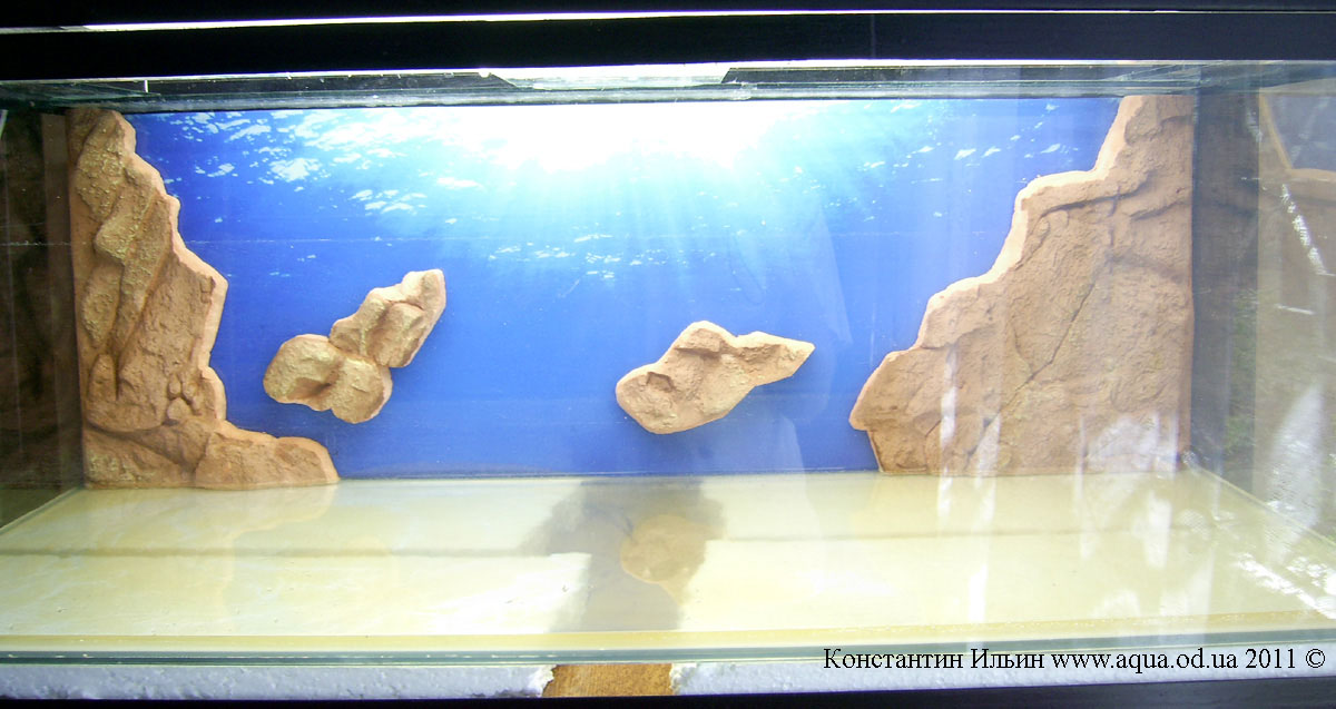 Июньское Фото нового аквариума на стадии запуска. Я переселил в эти 220 литров малавийцев. Пока в этом аквариуме нет грунта, хочу белый. Растения прикрепил к корягам и высадил в горшках в тот грунт который есть - морская галька.