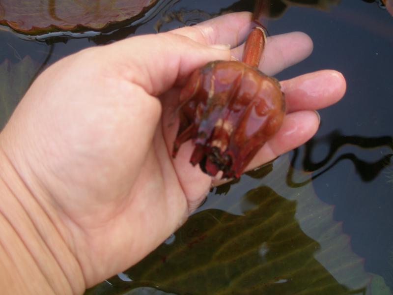 Пока Палыч занят обходом с дозором биоплат покажу по тихому семенную коробочку тропической нимфеи. В этом году много семян завязалось и на садовых нимфеях. Нашлись опылители и для них ( для информации: в диком виде нимфеи в Крыму не встречаются.)