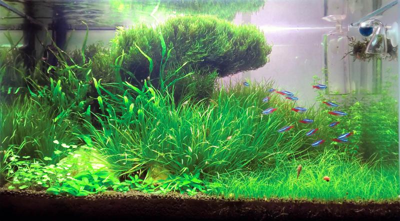 Три месяца жизни. "Тихие воды" стали по-настоящему тихими! Растительность набрала массу, неоны набрали вес :-). Как говорится, все растет и процветает... За прошедшие 3 месяца сложилось такое мнение, что баночка требовала минимального вмешательства с моей стороны! Как было ранее сказано, мы пережили легкую голодовку по УДО: уж долго пришлось ждать доставки. Больше всего на это отреагировала Blyxa japonica, слегка побледнела и потеряла в объеме! Еще из минусов, так это появление нитки в зарослях Eleocharis sp. 'mini':-(. Что касается положительных эмоций, то тут можно отметить достижение нормального роста Eleocharis sp. 'mini' и слегка увеличение в объеме Staurogyne repens. В плане растительности и жильцов произошли некоторые изменения: