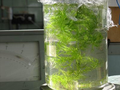 Ошибка 2: хотя визуально роголистник занимал порядка трети объема (см фотки), по массе это составило всего 5%. Видимо, в большинстве аквариумов ситуация аналогичная. рН поднимался очень медленно: за 3 часа от 5,56 до 5,78. Хотя я поленился (и это ошибка номер 3) поставить контроли: с пленкой но без растения и без пленки вообще, такое медленное повышение рН в закрытой системе с травой иллюстрирует, насколько большие потери СО2 в акве связаны с диффузией газа с поверхности. Вот, собственно, и все, что получилось с первого раза