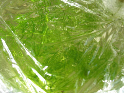 Ошибка номер 1: взял роголистник. Хотя его таки можно достаточно хорошо промакнуть от воды туалетной бумагой (т.е. до такого состояния, когда со следующим промакиванием масса меняется не более, чем на 10-30 мг, т.е. менее 1% при массе 9,2 г), но - он ломается! Причем потери составляют порядка 500-800 мг (т.е. до 10% массы), т.е. очень большие и вполне сравнимые с приростом. Т.о. прирост массы мне оценить не получилось вообще.