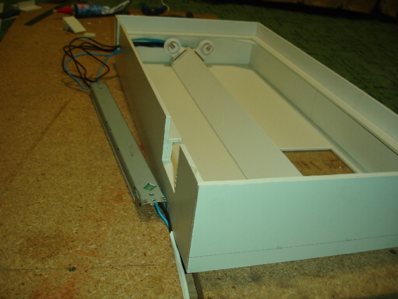 Предлагаю пару фоток на тему самостоятельного стряпания крышки для аквы 80 литров. Скажу сразу, это первый опыт, нигде не видел как делают но по примеру других "самоделок" сделал и я в свою акву. Ничего сложного нет, сначала разметку сделал на полу с помощью нескольких бумажных полосок, своего рода "лекало" или "образец". После подгонки макетика я принялся резать уже приготовленных материал. (Вспененный ПВХ) для рекламы. Нарезав заготовок, склеил их спец. клеем. Готовый каркас покрасил краской для автобамперов. Она немного при высыхании становится на ощупь шероховатой (в этом прикол особый). После полного высыхания и проветривания я ее подверг термической обработке, направил на крышку приближенный прожектор и горячим лучем света выпаливал остатки химического смердящего состава. Затем крышку обклеил зеркальной пленочкой и получилась отличная крышечка несущая на себе балласт и две лампы. Балласт вынес на наружу, так как греется. Вобщем все есть на фото. На первом этапе использования ..пару рыбок отошло в мир иной! Потом все утряслось и выветрилось. Уже пару лет - полет нормальный!