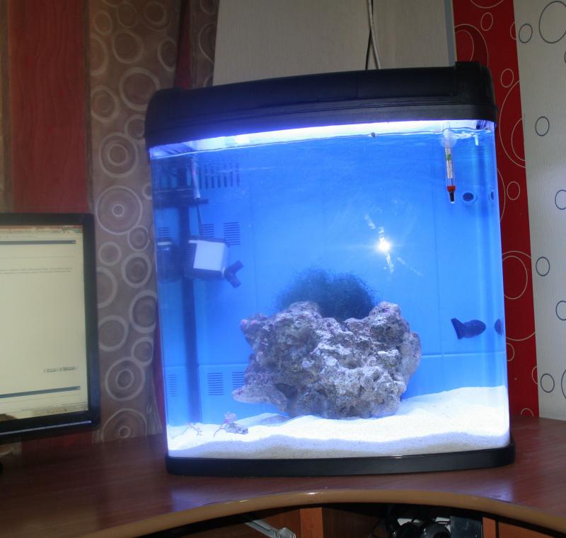 Колоть его передумал,ну уж очень он мне нравится  позже докуплю мелких и выстрою норм риф.Вчера вечером помпой здуло две офиурки с камня,одна куда то делась а вторая кружилась под течением,может она того уже...и наблюдал кучку мелких креветок и червей.А сегодня что-то пусто было,ничего не выползало ....И наконец то поставил скиммер.Соленость 1.025