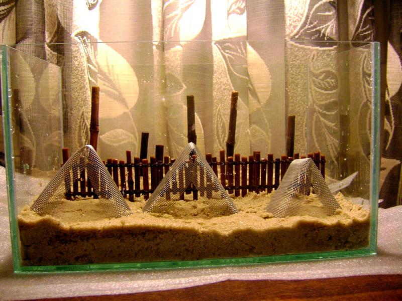 Забор- бамбук, стволы будущих пальм- тоже. Все выварено по всем правилам приготовления коряг. Каркассы шалашиков- сетка из нержавейки, которую наша мама потом аккуратно обошьет мхом. Мы решили отказаться от шалашей из дерева- реконструкция фотографии, конечно, дело очень нужное, но заросшие мхом шалашики, на взгляд нашего капимтана придадут нашей сказке больше чисто аквариумного уклона)) В конце концов, имеем мы право на авторское "прочтение" фотки из интернета?