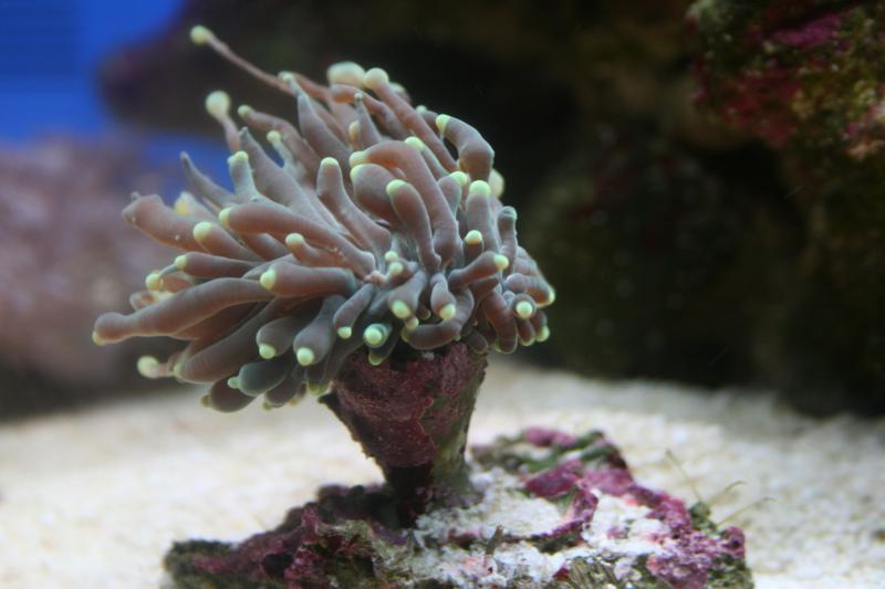 Ту актинию поставь лучше так, что бы на нее свет не сильно светил. Лучше так, что бы над ней камень нависал. Она нефотосинтетик, свет ей особо то и не нужен. А то сбежит, будеш потом искать в какую щель она залезла. И течение тоже не сильно любит она. И сарка с эуфилией, покс есть место, разведи по разным сторонам аквариума. У меня они не сильно любилр друг друга. Глядиш и сарк откроеться.