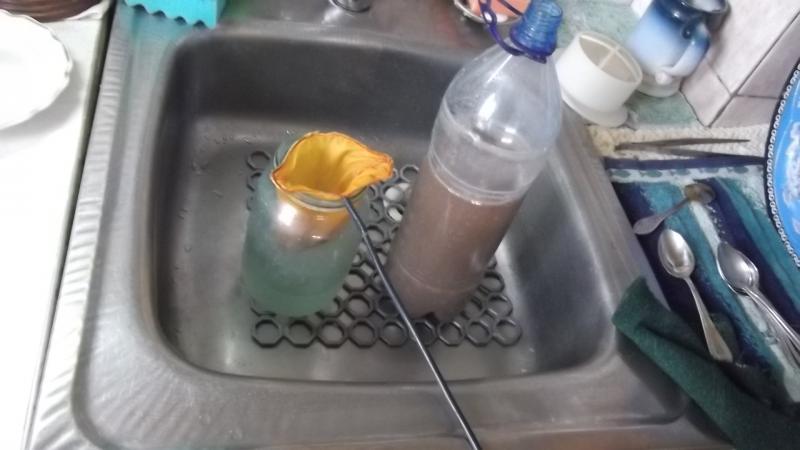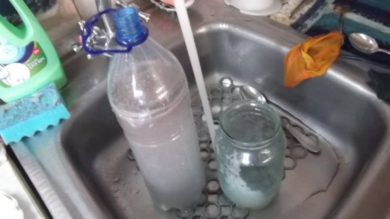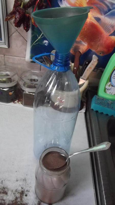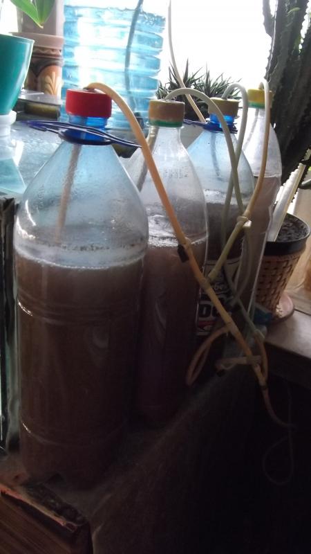 Для инкубации яиц я использую 2-х и 3-х литровые баллоны от газировки /см.фото 1 - слева 2-х , справа 3-х литровый/ . некоторые пользуют 3-х литровые банки , я привык к пластику с завинчивающейся пробкой - отсутствие брызг и как следствие "соляных сталоктитов" . В пробках от баллонов разогретым гвоздем или дрелью делаем отверстие для шланга подачи воздуха , на конце которого одет распылитель . Еще одна деталь - краник регулировки подачи воздуха . Для одного помета живородки достаточно одного баллона . Система понятна на фото 2 . У меня подключено 4-е балона - много малька , когда малька мало , я убираю лишние баллоны . Итак начнем - на фото 3 - засыпаем яйцо артемии из расчета 1 чайная ложка на 2 литра солевого раствора . Далее заливаем в баллон/см. фото 4 ./ , примерно до 1 литра холодной воды из под крана . В литровую банку насыпаем три с горкой столовые ложки соли /см. фото 5 ./ и заливаем горячей водой из под крана , перемешивая ложкой для лучшего растворения /см. фото 5 / . Выливаем горячий солевой раствор из банки в баллон с холодной водой и 1 чайной ложкой яиц . Итоговая стартовая температура раствора в баллоне для инкубации 27 - 34 градусов . Такой широкий разбег не критичен . Баллон стоит в метре от окна и температура зимой быстро опускается до 25 - 26 градусов . Специально раствор в баллоне не подогреваю - через двое суток использую для кормления живородки . Количество соли на 2-х литровый баллон не сильно кретично - по Игорю Шереметьеву 3- 4 столовые с горкой ложки соли. Поэтому сильно и не упорствую в растворении соли при перемешивании в банке , смотреть / на фото 6 ./ остатки соли на стенке банки после выливания. Через 1,5 - 2 суток использую науплий артемии для кормления . Если малька мало , или при 3-4 разовом кормлении новорожденных мальков , сливаем часть через сачок в банку , а затем из банки отфильтрованный рассол обратно в баллон /см . фото 7/ . На фото 8 видно сколько науплий получается при процеживании примерно 1/4 части баллона. Главное - приобретать яйца артемии с нормальным выходом науплий примерно 80 % и более процентов. Тогда не нужно будет морочить голову с активированием яиц гидропиритом и другими ухищрениями . При хранении сухих яиц в морозильной камере % выхода науплий увеличивается . Это предусмотрено природой и биологией вида - яйца артемии в природе зимойй замерзают и тем самым активируются , при повышении температуры весной , до оптимальных значений , происходит дружный выклев .