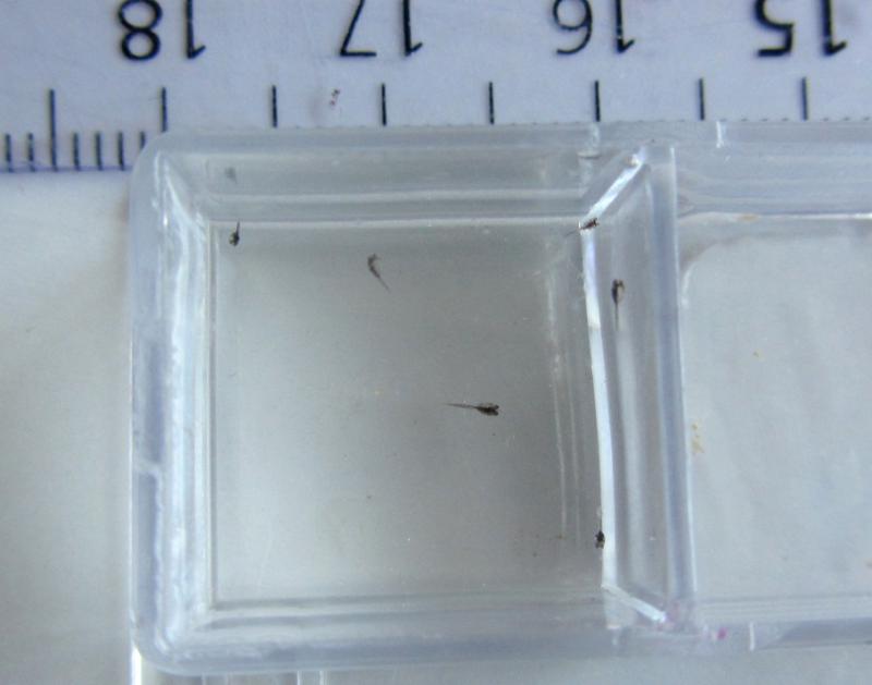 Зранку побачила перших личинок. Вони найменші серед тих риб, що доводилось мені розмножувати (принаймні так здалось). Маленькі прозорі кульки з чорними оченятками і хвостиком вправно тікали і ховались за річію. Самець розгубився і перестав брати участь у житі своїх дітей, тому був успішно пересаджений у загальний і без жодних докорів совісті почав активно плавати у пошуках їжі.