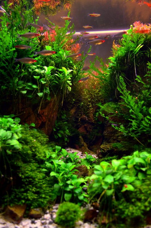 Ностальгия, Родостомусы- оказывается они могут служить инструментом для ухаживания за некоторыми растениями. В общем так, мох (кристмас и павлиний) , разростается и его приходится очень часто триминговать, а с помощью родостомусов этого делать не надо, они обкусывают точки роста, там где могут достать и мох приобретает такую форму, что с ножницами не достичь, заросли становятся плотными и ровными, такая же фигня с кубой, но с начало её надо наростить, а потом пускать красномордных и они её будут поддерживать в нужной форме.