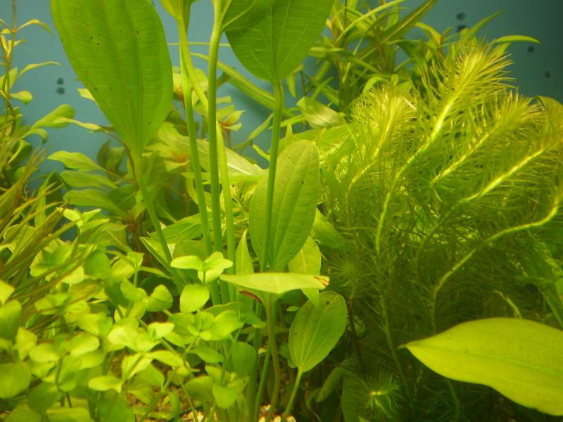 Внёс монорасстворы нитрата и фосфата расчитав на 10 мг/л по нитрату и 1мг/л по фосфату.Также микро на ОЭДФ с солями РЗЭ на 0.1 по железу,СО2 из баллона 1 пуз. в сек.На данный момент картина такая как на фотографиях внизу. Растения воспряли,стали расправляться,появились зачатки новых листиков у эхинодорусов,верхушки некоторых длинностебельных растений начали принимать розовый оттенок.Через час после подачи СО2,на растениях появились пузырьки кислорода. Скрытый текст