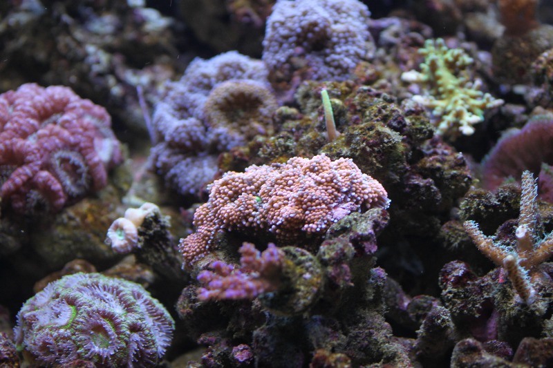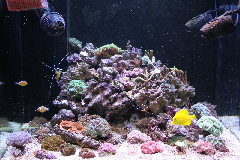 Была проведена небольшая перестановка камней и кораллов. В конце месяца думаю окончательно все расставить по своим местам и докупить животных. После этого планирую оставить в покое аквариум годика на пол.