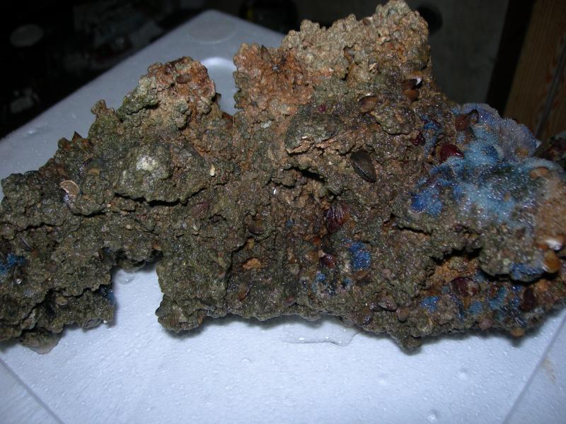 На камне присутствуют- губки, кальциевые черви, двухстворчатые моллюски(мидии, устрицы), незначительное количество водорослей. Попадаются крабы пауки и мелкие креветки(до 1см в длину, вид пока не определил) Очень пористые.