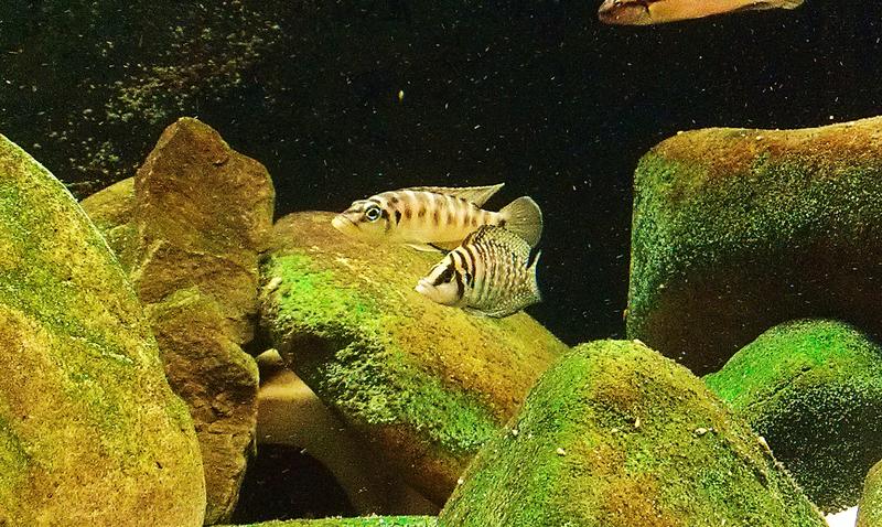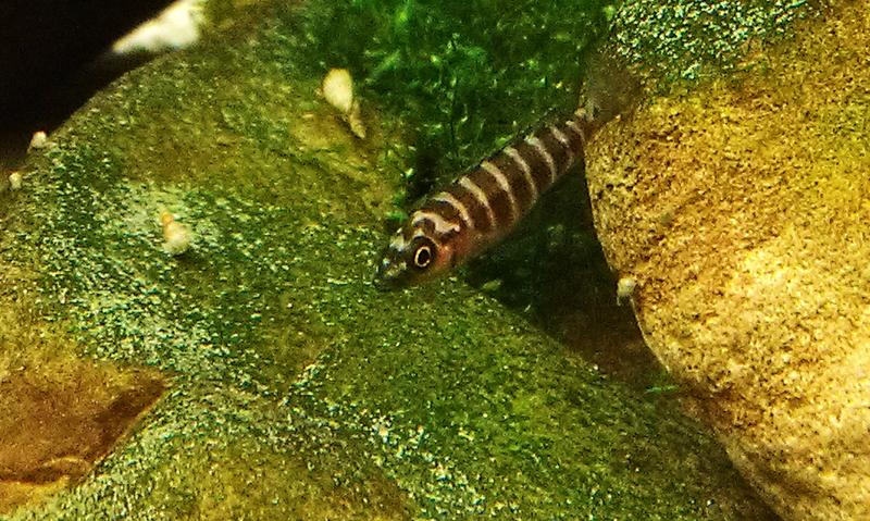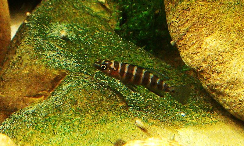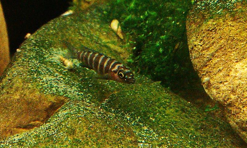 Тельматохромисы вроде бы отнерестились.Самочка сидит в рапане а самец отгоняет от гнезда всех рыб,вступая в "бой" даже с самцом цилиндрикуса который тоже сейчас занят охраной своего выводка.На фото самец во всей красе.Последне фото-это он же на охране рапана в котором сидит самочка.