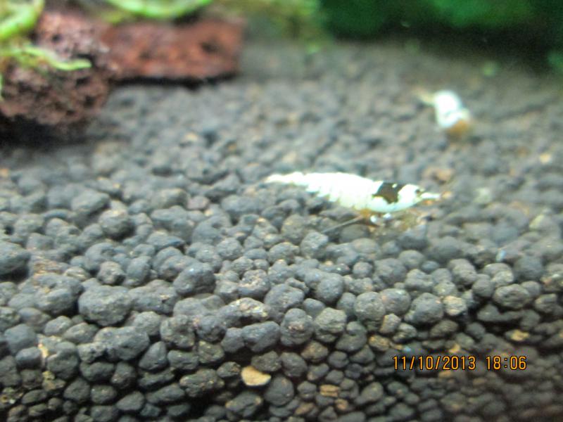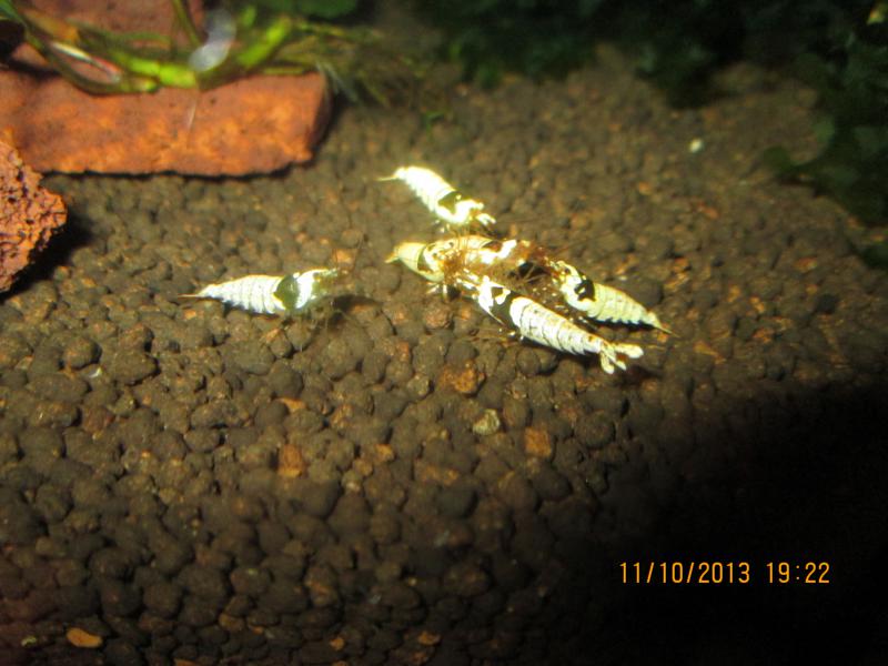 а вот они все жруть)))) самому интересно в чём моя креветулька но это не пигмент! все 6 живы-здоровы, фото сделано со вспышкой только что в тёмный аквариум