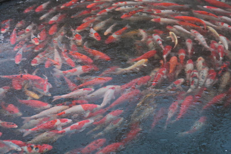 В Ниигате редко кто подкармливает, потому что в бассейнах, где содержится взрослая рыба, обычно или нет фильтра нормально размера или он вообще не работает. Просто делают водообмен. Поэтому и не кормят рыбу с ноября по апрель.