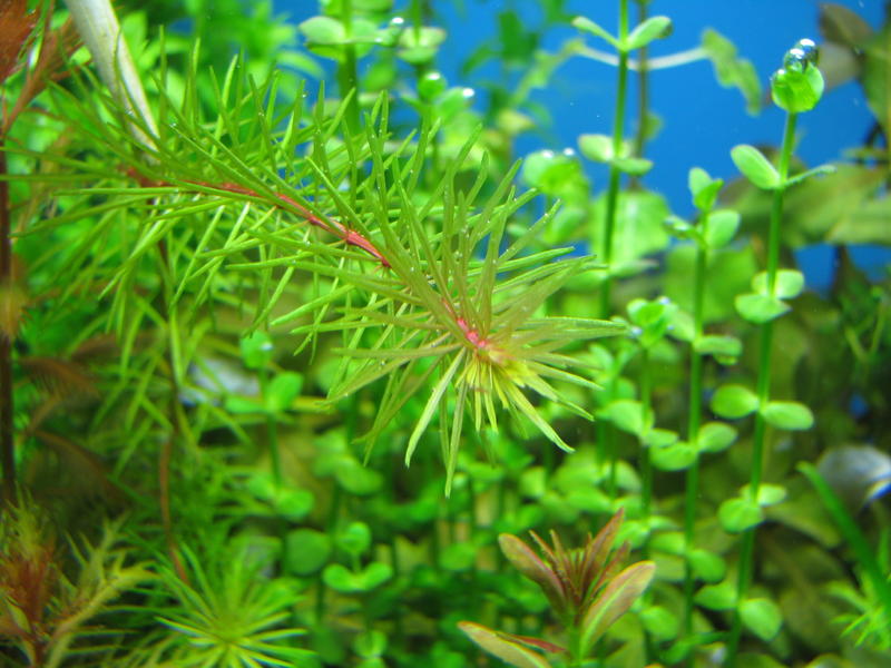 4 ветки пока еще редкого растения Rotala sp. "Bangladesch". Красивое длинностебельное растение. Не очень требовательно и выносливо. По строению близко к Rotala sp. "Nanjenschan", но, как помне, менее сложное. У меня растет в воде с GH - 8, KH - 0, pH - 6.5, CO2, удобрениями (полный спектр), температура может быть высокой. При таких условиях окраска такая как видно на фото. Попробуйте!