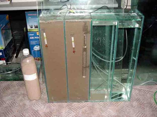В нем должна быть хорошая аэрация ( будет компрессор), температура воды 27-28С (будет обогреватель) и свет на рисунке видно лампочки. За 24 часа из яиц Артемии вылупливаются рачки. И новый отсек, как раз таки служит для того, что бы из грязной воды большого отсека получить чистых рачков. Между отсеками есть перегородка, которая не просвещается, она состоит из двух пластин. Одна из них цельная, т.е. закрывает доступ между отсеками, а вторая имеет полоску 4 см с отверстиями 2-3мм в нижней части платины. Живые рачки тянутся к свету поэтому для получения рачков необходимо выключить аэрацию и свет в большом отсеке, открыть перегородку т.е. доступ к отверстиям и вкл. свет в маленьком отсеке. Таким образом, все живые рачки переберутся в маленький отсек.