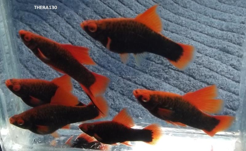 В этой части согласиться полностью не могу . У меня одна из линий черных меченосцев разводятся "в себе" уже поколений пять/или больше/ . Из их пометов отбирается рыба самцы и самки черное на красном /альфа/ , без добавления других цветовых варитетов и запускается в этот аквариум для дальнейшего разведения . Вопреки Вашим словам современные линии , повторюсь - современные линии черных меченосцев не стерильны - как самцы , так и самки в своем подавляющем большинстве в помете /не более чем в других породах/ . На фото 1 , отобранная молодеж перед запуском в аквариум , где содержатся производители черных меченосцев/альфа/ , которые размножаются вопреки Вашим утверждениям , " в себе" уже более пяти поколений . И если будет нужно , кровь буду подливать через черных самцов /альфа/ других линий . Пока необходимости в этом нет . Вторая линия разведения заключается в седующей системе . Черные на красном - стадо производителей - самцы и самки занимают отдельный аквариум . К ним подсажены самки рубина , самки черного альбиноса . Пометы получаются от всех трех групп самок . В эту линию запущен/внесен/ ген альбино , через рубинов . Чтобы не получать слишком много черных альбиносов /см.фото 2/ , хотя спрос на них есть , периодически в это стадо производителей запускаются черные на красном /альфа/ самцы из первой линии - свободные от рецессивного аллеля гена альбинизма . Такое разведение запущено для того , чтобы получить как можно больше черных на красном/альфа/ меченосцев . Рынок диктует свои условия - никому и даром ненужны черные на серых или светлых плавниках , которые еще мальком сливаются .... Можно разделить черных меченосцев на две группы - совковых и современных . Очевидно утверждая , что черные меченосцы разводятся только с использованием других пород меченосцев , вы говорили о совковых черных и описанных методах разведения в совковой литературе . У совковых линий черный пигмент частично выходил на хвостовой плавник . В любом помете мальки с таким дефектом заканчивали свою жизнь не от старости . а от меланомы . Современные , завозные линии полностью лишены этого деффекта . Соглашусь в той части , что незначительная часть черных самок остается стерильны , но этот процент не боле , чем процент стерильности производителей в некоторых других ( и даже гомозиготных ) породах меченосцев . .  .