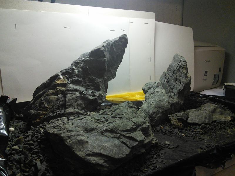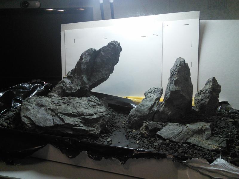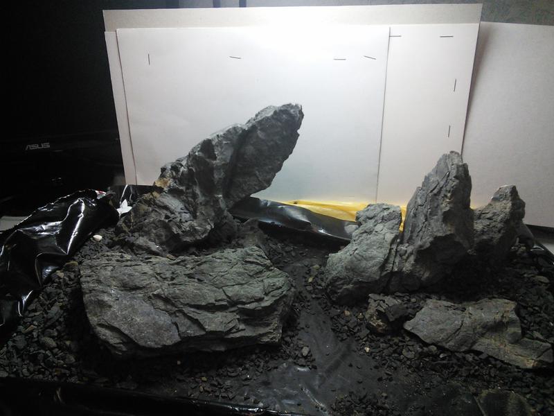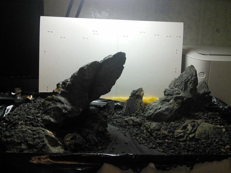 Может есть смысл насыпать грунт в акву и уже там пробовать выкладывать камни ? С учетом того что и грунт под углом будет.