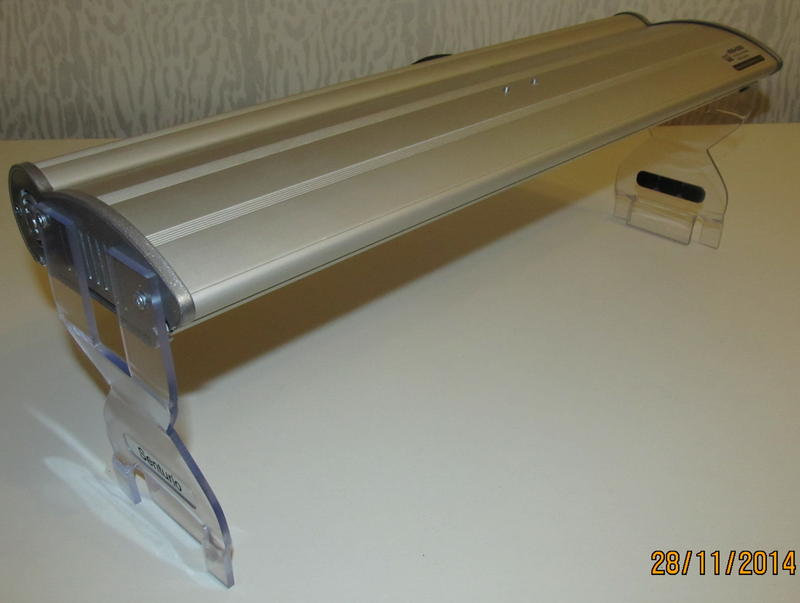 Поскольку товар по словам владельца увы имел лампы низкого качества - отработали не более 4 месяцев, светильник благополучно лежал на полке пылился пока я случайно не предложил хозяину его наполнить LEDами. Вот фото переделанного светильника - на акву 30 л (40*25*30) он будет установлен заново хозяином, я тестировал пока по свету на своем нанике. Пришлось поставить новые ножки по просьбе Заказчика ибо старые еле помещались на боковые стекла.