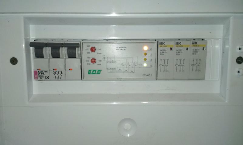 Слева трехполюсной входной пакетник, справа- три контактора. На устройстве выставляется нижний и верхний приемлемый предел *по напряжению. Желтый светодиод *показывает к какой из трех фаз в данный момент подключена нагрузка. Переключение с фазы на фазу занимает около 2-х секунд. Контакторы нужны, если мощность нагрузки превышает 16 А.