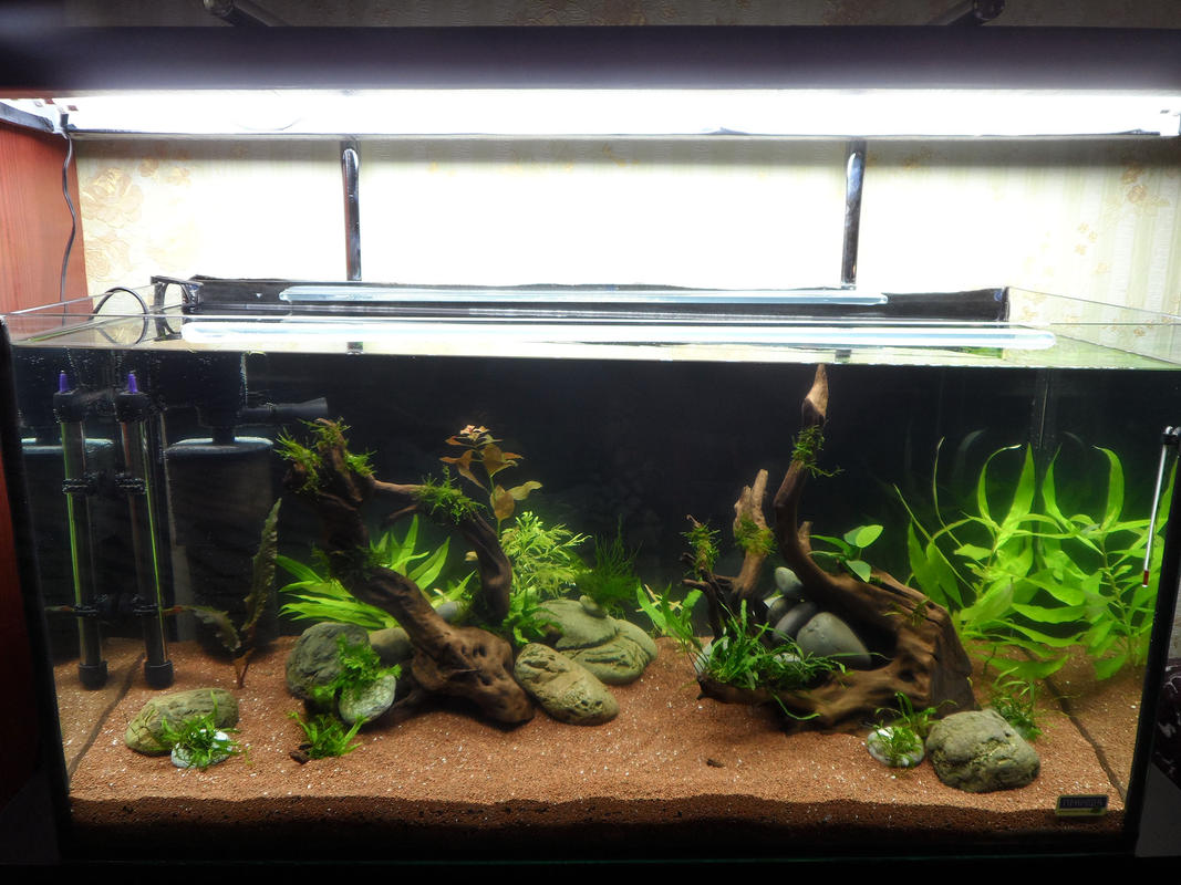День второй. Муть от манадо осела... хотя и мыл его три раза - всё равно очень пыльный, но зато лёгкий  По газу планируется бражка... со второй недели. Диффузора нормательного нет, городить колокола не хочется..поэтому скорее всего разбивать пузырьки СО2 в пыль будет акваэль турбо.. Световой день сейчас 5 часов, постепенно буду добавлять. Из УДО буду использовать продукцию тм Птеро, но пока об этом еще рано говорить. Думаю через недельку начать сыпать калий в виде сульфата. По поводу круглых камней - да, есть такое дело - они родом с морей) Но вроде не фонят, уксус ничего подозрительного не показал... Да и уберу я их скорее всего, как коряжки окончательно воды наберутся. Вот что меня начинает беспокоить - так это то, что некоторые растения, в частности папоротники - достались мне с нитчаткой...я её недосмотрел, а теперь она похоже себя стала очень вольготно чувствовать  Вот я и думаю... что с ней делать. То ли просто упорно выбирать вручную, то ли еще плюсом бухнуть птеро альгин супер?...