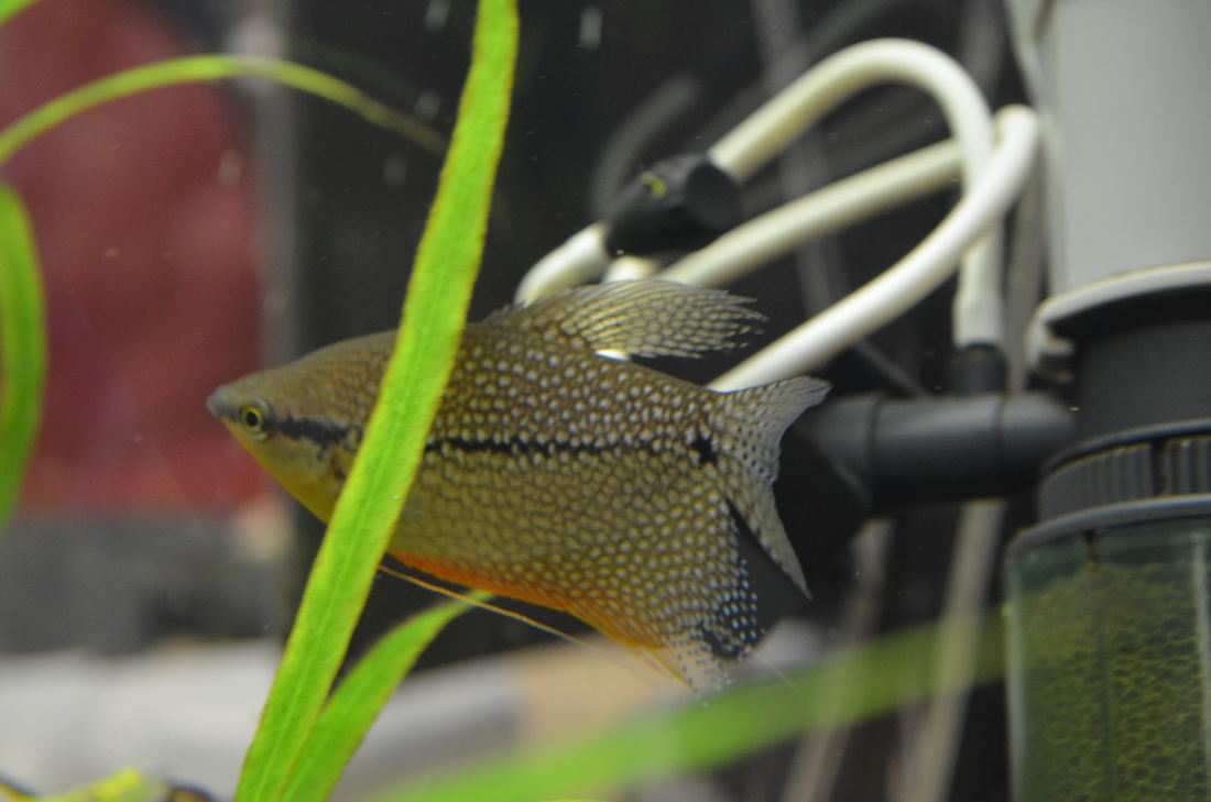 Были взяты гурами, чтобы обжить аквариум. Со временем провели голосование и было решено взять золотую рыбку, телескопа и севелий со стурисомами, чтобы всё это красиво обитало в аквариуме. Но одна из сотрудниц увидела в интернете фото и видео с астронотусами - это была любовь с первого взгляда. Вычитав слёзную историю про долгую и счастливую совместную жизнь одноглазой золотой рыбки и астронотуса на каком-то интернет ресурсе, мы решили взять маленького астрика в нашу акву.
