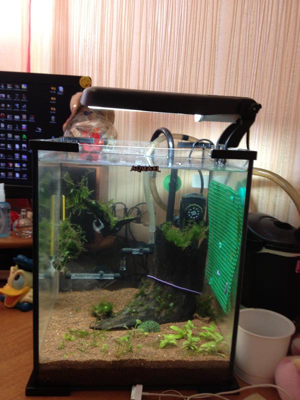 Запущен 26.03.2014 30 литровый кубик акваэль. Планировал травник с креветками. Вода осмос+реплениш,грунт жбл манадо,фильтр ресан cy 20,свет лампа ,которая была в комплекте 11 ват и добавил енергосберегалку 20 ват.