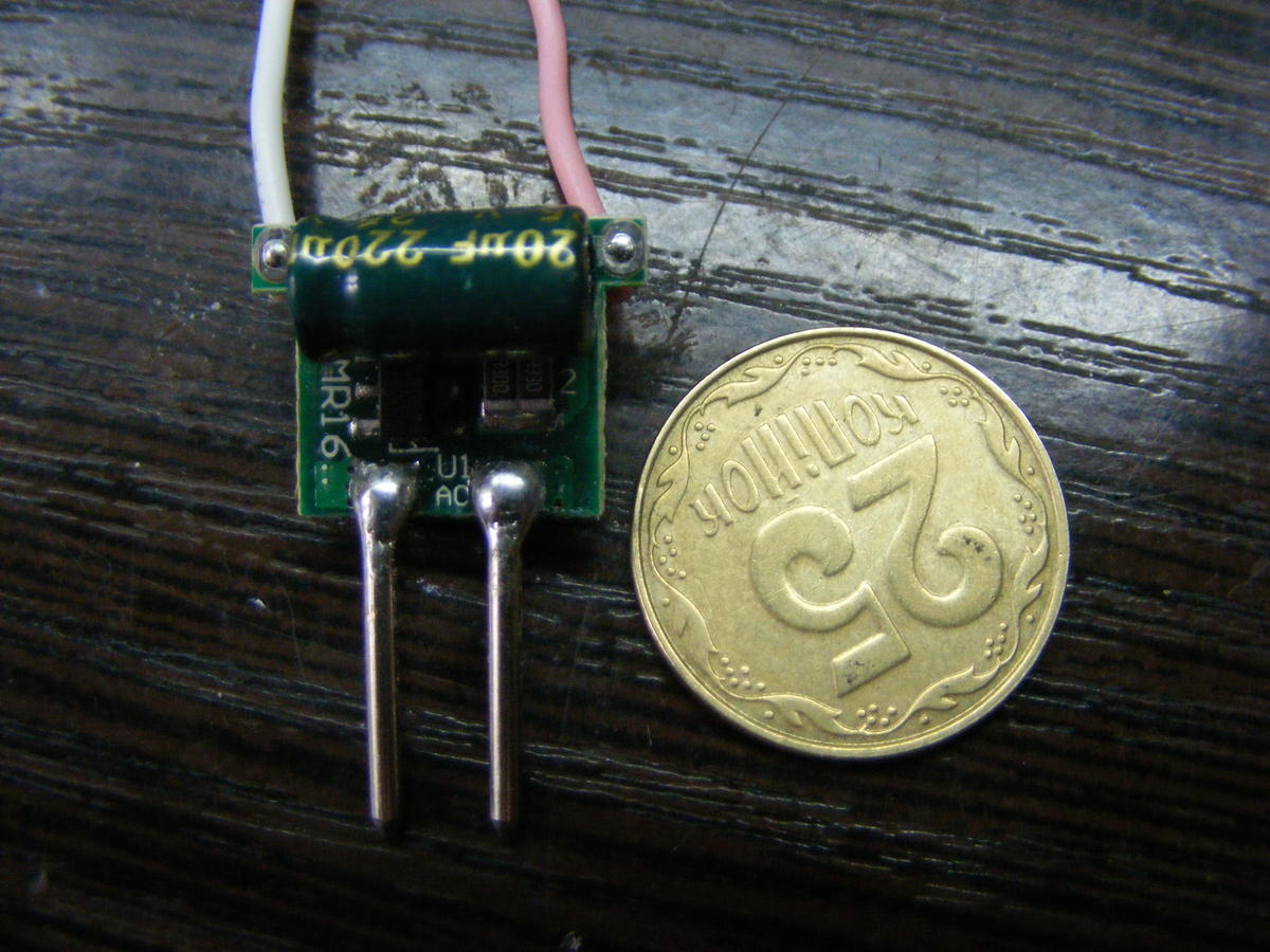 На фото видно что никаких особых деталей там нету. Вообще этот драйвер сделан для лампочек с цоколем MR-16. Питается драйвер, по задумке создателей, переменным напряжением 12 вольт. Вроде как не очень много..... Но в описании микросхемы читаем, что напряжение питания для микросхемы максимальное 30 вольт и ток, 1 ампер.