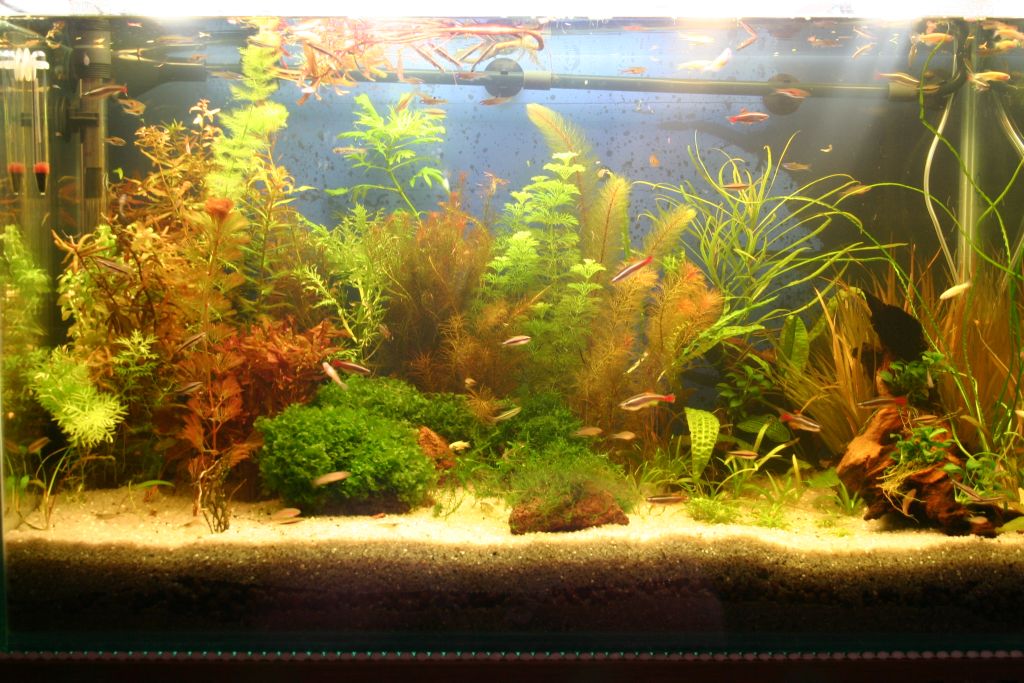 За 11 дней стекло покрылось легким водорослевым налетом, на растениях и корягах его не видно. Свет сильный, брага. Растения тронулись в рост через пару дней. Пузырчатка выросла больше чем в 2 раза. А бликса выпустила цветонос