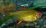 ...Так случилось,что в начале лета получил рыбок,которых,честно признаюсь,воочию,т.е. своими глазами до того не видел.Владимир 456 ,хозяин рыбок,передал мне их со словами:"Попробуй,поиграйся.Разведи".По литературе рыбка не сложная, типа всех Амазонских ТЕТР.Называется Тетра Хелиакус.Hyphessobrycon Heliakus.Как-то встречал в литературе её кличку.Тетра Китти.На практике оказалось, не так просто её развести.Например,ПРОСТО не набирала икру.Дальше--подбор водицы.В июле немного развел их,но кошмарная жера и моя ошибка сократили поголовье.В общем,вот несколько моих фото взрослых производителей и малька.Рыбка маленькая .Не более 2,5см.Ну,а малек-сами понимаете.  .Может у кого и 3 см взрослые.Окрас не притязательный,но чем-то привлекает и нравится мне.Спокойная.Но только не при нересте.Тут пара самцов давала ну,просто бой быков,иногда и маленькие брызги летели.Красив верхний плавник самцов,длинная коса.Плавнички на солнце розоватые.А основной фон её немного оливково зеленоватая ,но не сильно.На ссылке дам фото рыбки в инете.А на фото-мои взрослые и малек.Правда, там они вместе со щучками и нанностомусами в выростном ак-ме.Ну,надеюсь ,разберетесь,кто и где..