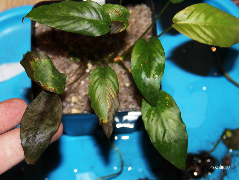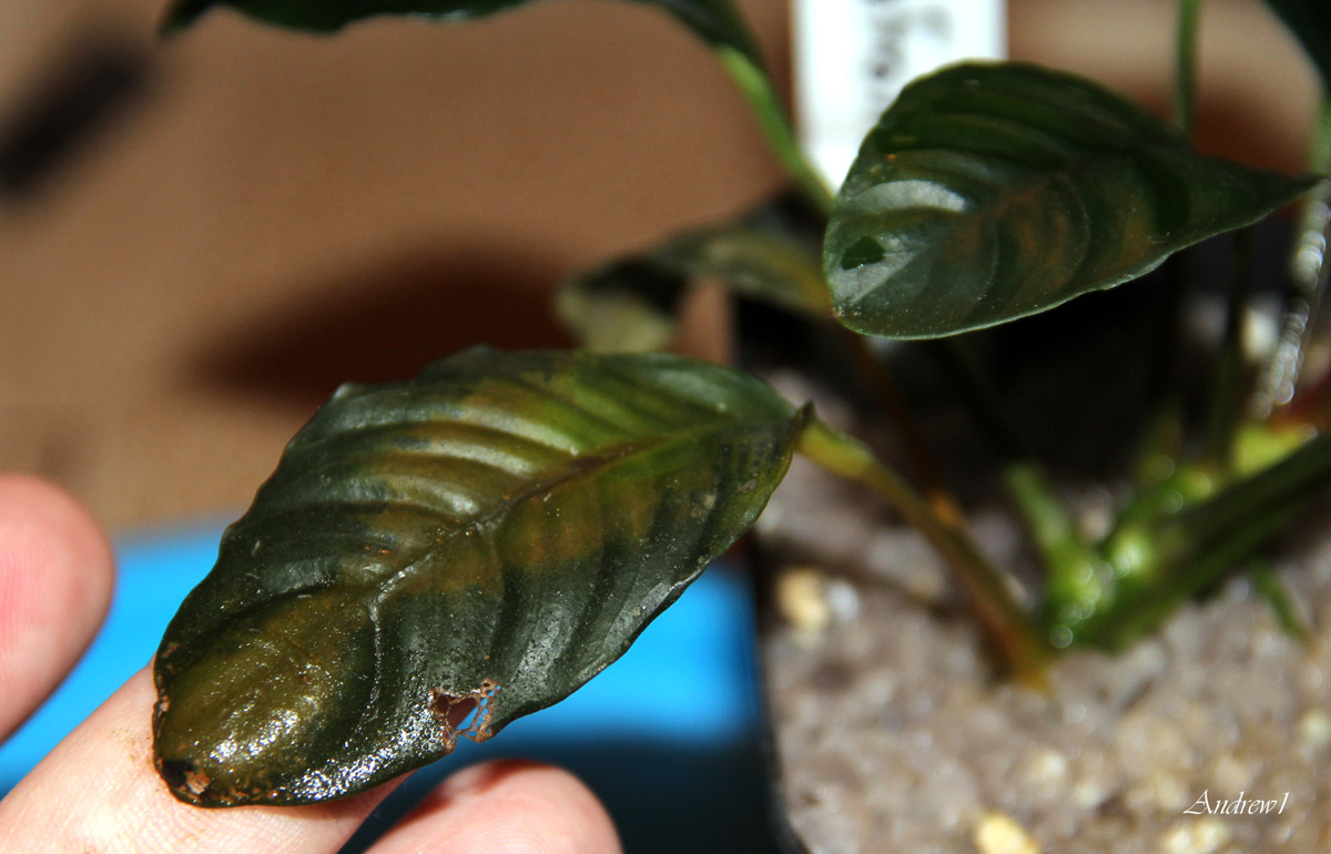 Началось всё с Каладифолии,потом пожухла(склоняюсь что пересохла,но новый лист какой-то ..вообщем не нравится мне  )Бартери вар.бартери,ну и когда на Кофефолии старые листья начали пропадать,а новый не такой,как обычно были-решил достать и провести хирургическое вмешательство.