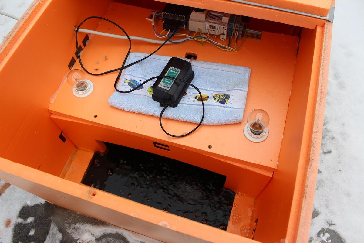 То, что конструкция получилась герметичной, скорее плохо, чем хорошо. Компрессор нагнетает в пруд воздух, уже бывший в употреблении, а следовательно с низким содержанием кислорода. Забор воздуха нужен снаружи. Электронику из волшебной коробочки неплохо бы убрать в другую коробочку, желательно IP65, и расположить ее отдельно. Внутри волшебной оставить только датчик термостата и питание для компрессора и обогревателя. А для поглощения вибрации от компрессора вместо полотенца лучше подойдет поролон, хотя... Тогда не будет рыбок...